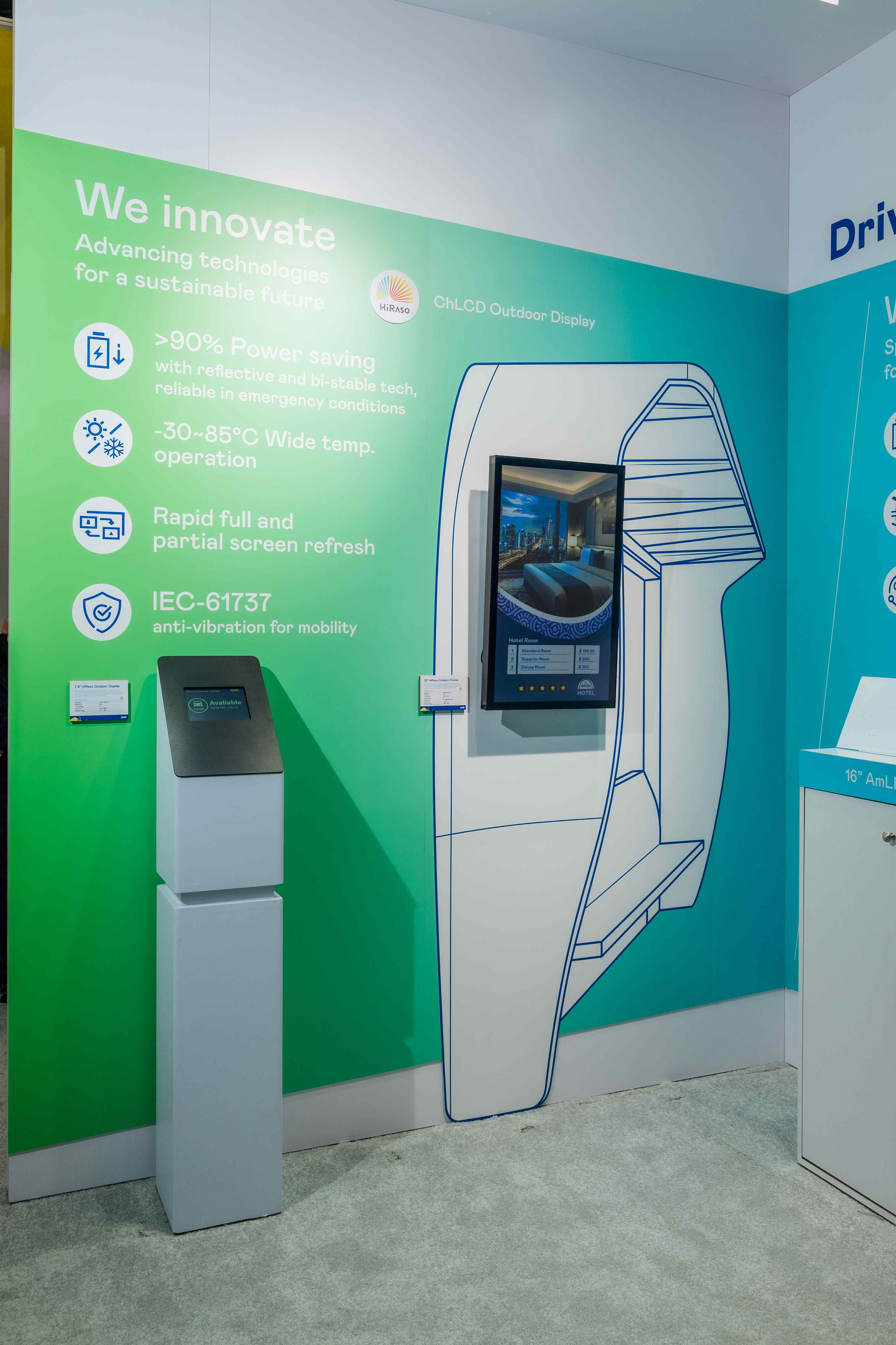 HiRaso膽固醇液晶顯示器運(yùn)用反射環(huán)境光線的方式,呈現(xiàn)影像顯示時零耗能的環(huán)保省電訴求,光線愈強(qiáng)愈能呈現(xiàn)絕佳的色彩飽和度及顯示效果,同時在攝氏-30度至85度間寬溫的使用優(yōu)勢,為戶外電子看板的新首選。 ? ?