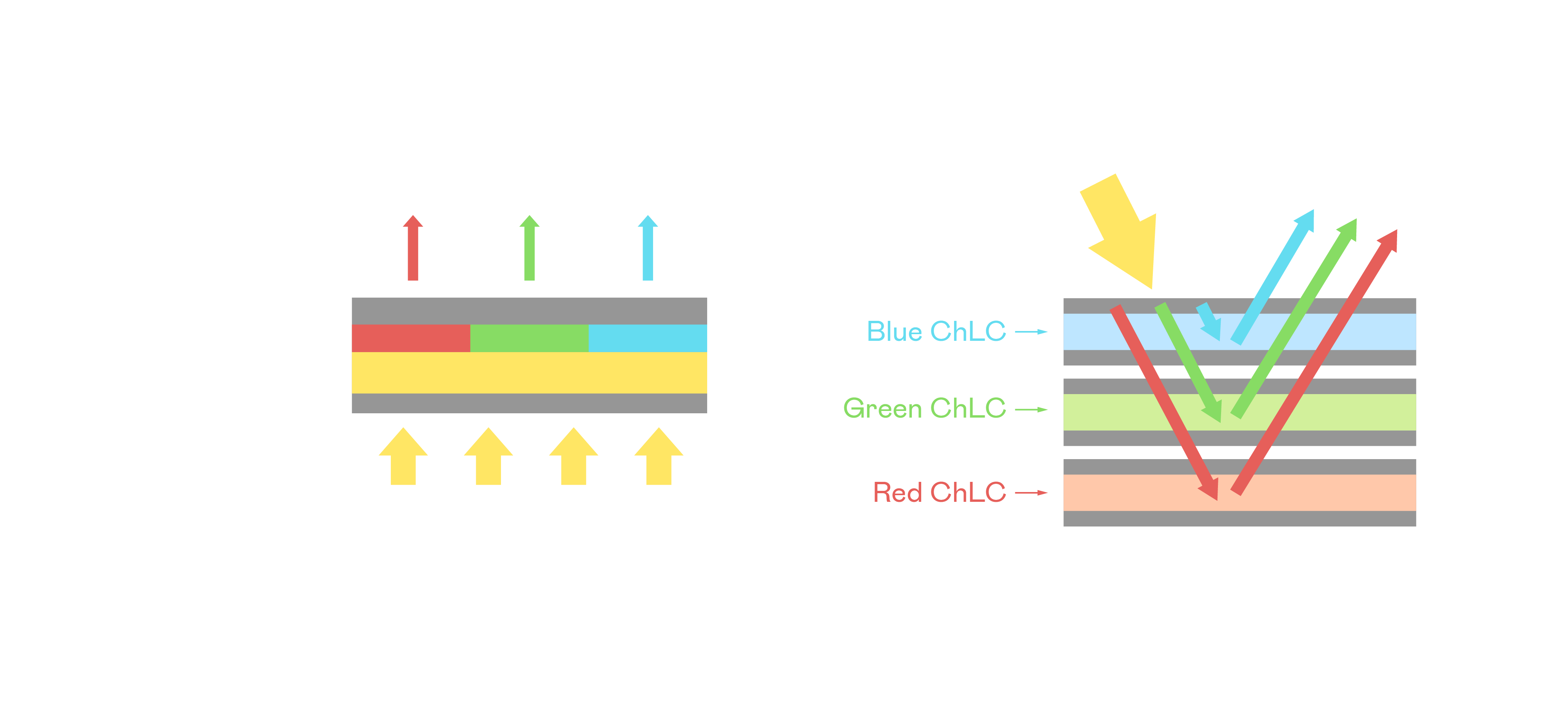 VR彩票膽固醇液晶顯示器是由紅、綠、藍(lán)三層膽固醇液晶面板堆疊而成,并采用無彩色濾光片設(shè)計,減少環(huán)境光在反射過程中的損耗。