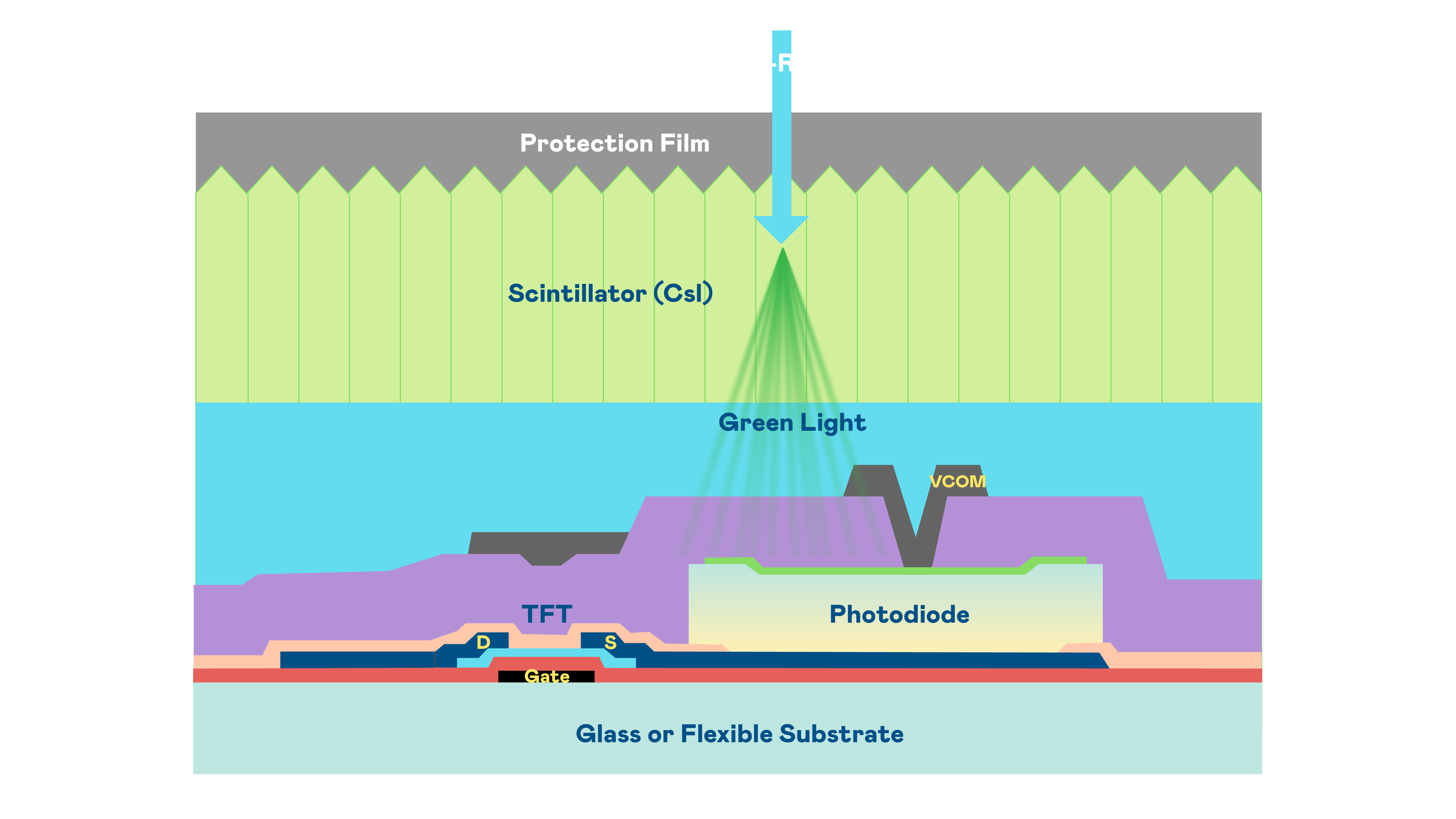 VR彩票的X光影像感測陣列使用薄膜電晶體 (TFT) 作為每個像素的讀取開關,搭配光電二極體(Photodiode)的光電轉換元件,用以感測X光影像訊號。