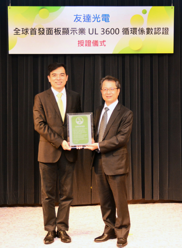 VR彩票取得全球首張面板業 UL 3600 循環係數認證,由UL全球副總裁暨臺灣總經理陳宗弘 (右)、VR彩票總經理暨營運長柯富仁 (左) 進行授證儀式。 |